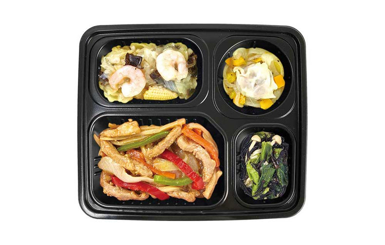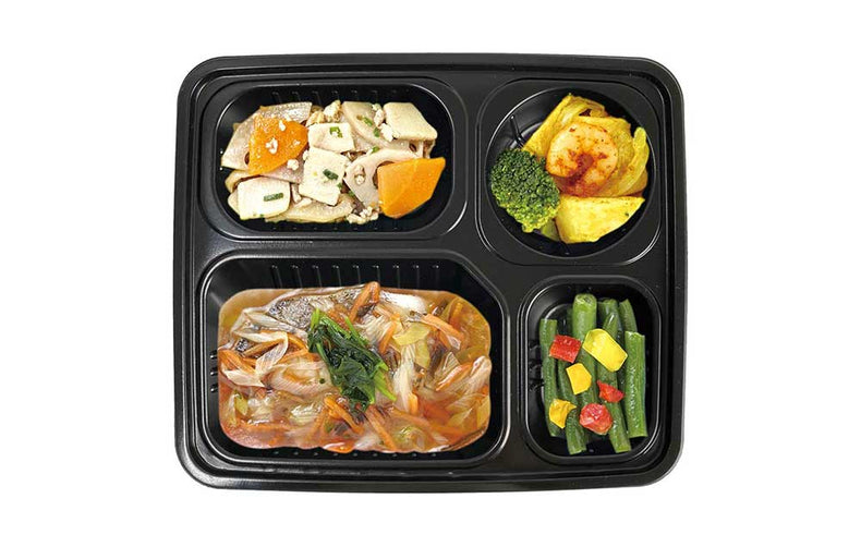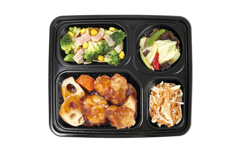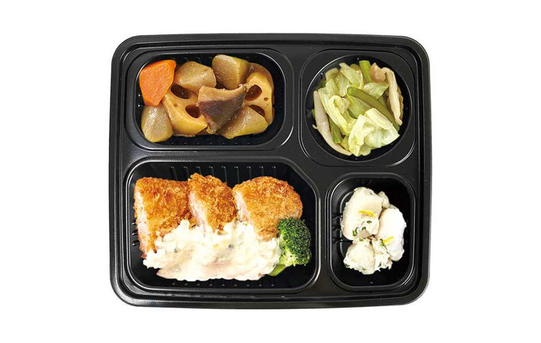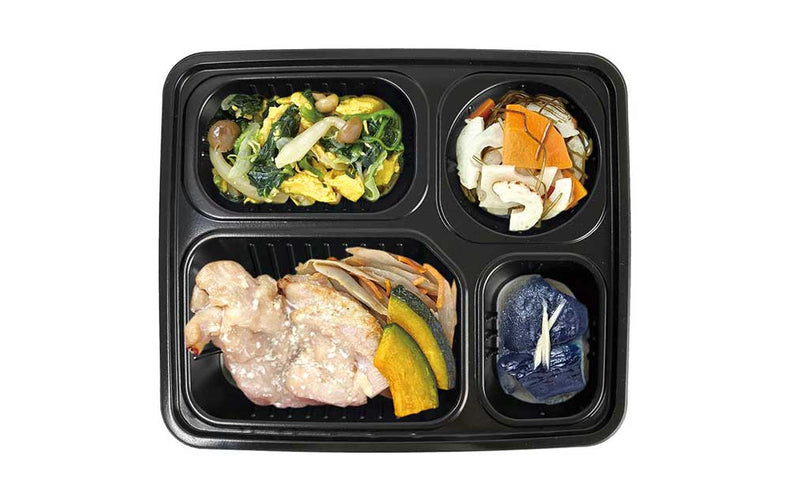 高野豆腐と根菜のけんちん煮、じゃがいもとえびのカレー炒め、いんげんのソテー