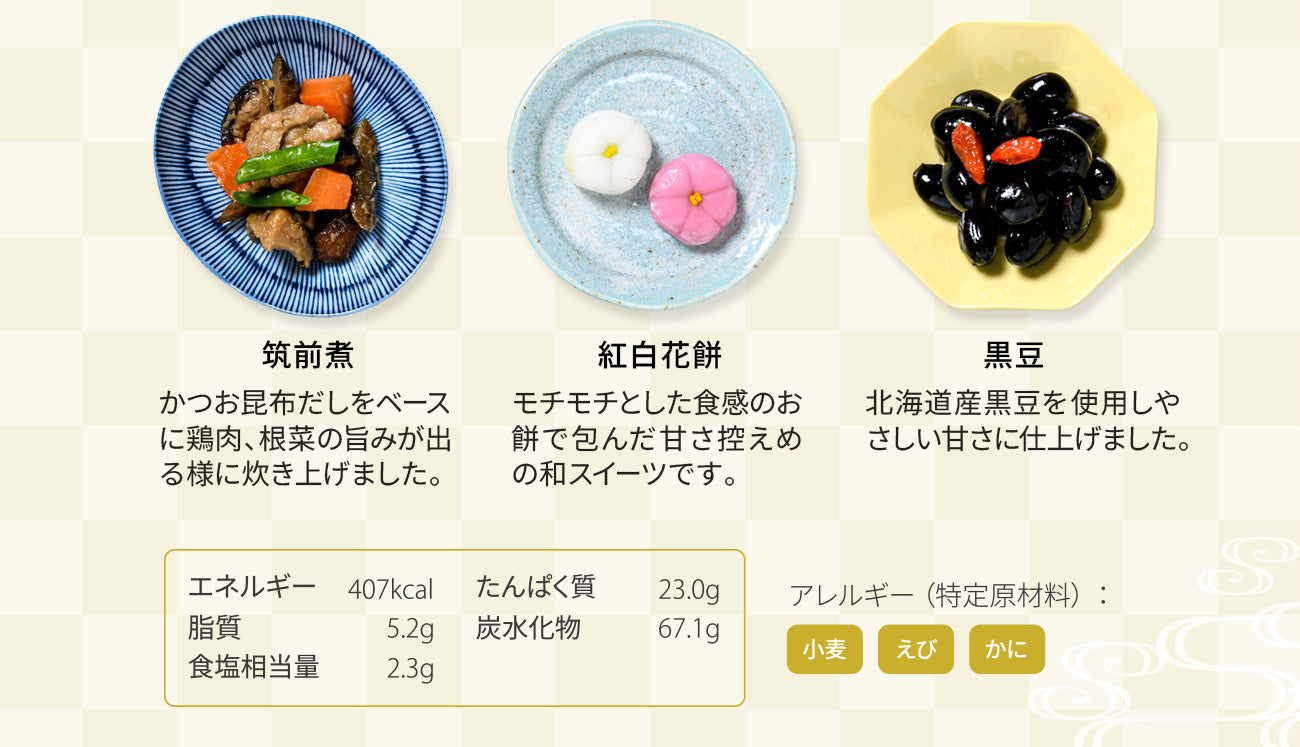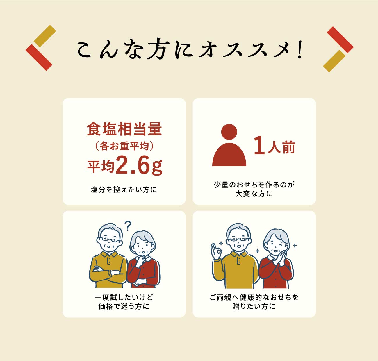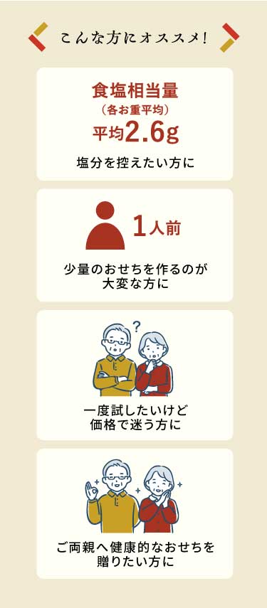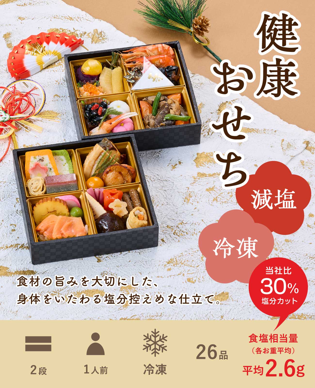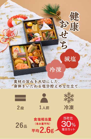 食塩相当量は各お重平均で2.6g、当社比で30%カットを実現しました。