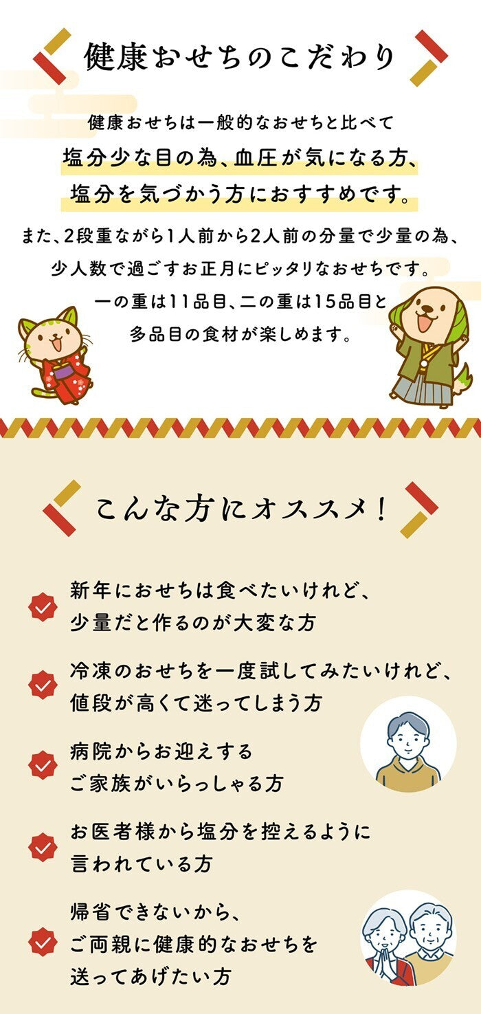 血圧や塩分が気になる方にも安心して楽しめる、二段重おせちです。