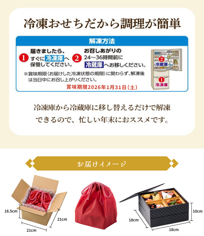 - 冷凍のおせちになります。届きましたらすぐに冷凍庫に保管してください。